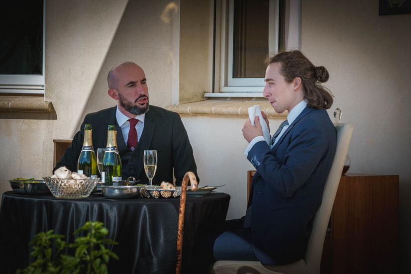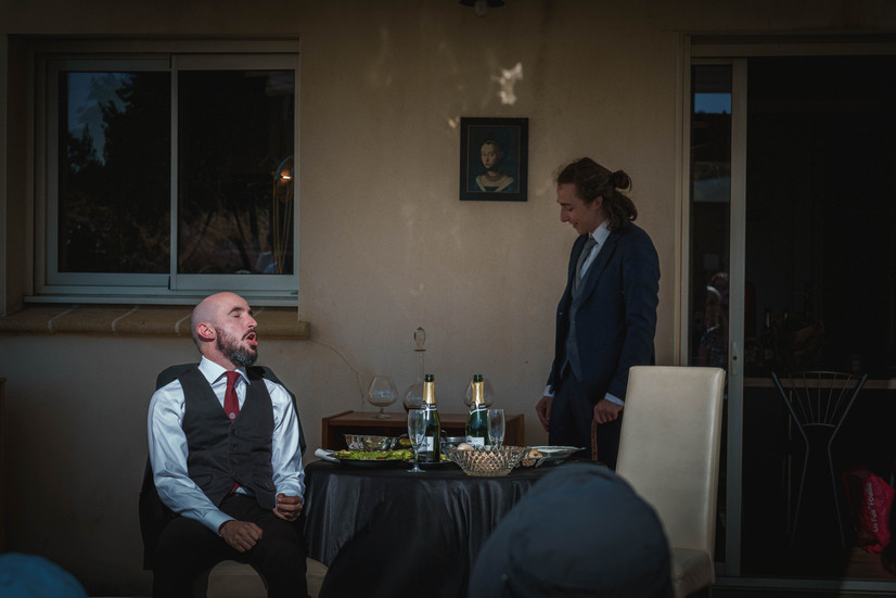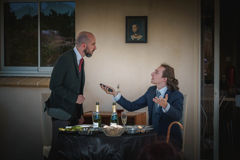A l’occasion d’un apéritif avec 20 à 30 personnes, la compagnie se charge de la mise en place de la pièce, de la représentation et du rangement du décor après, vous vous chargez juste d’inviter vos proches.